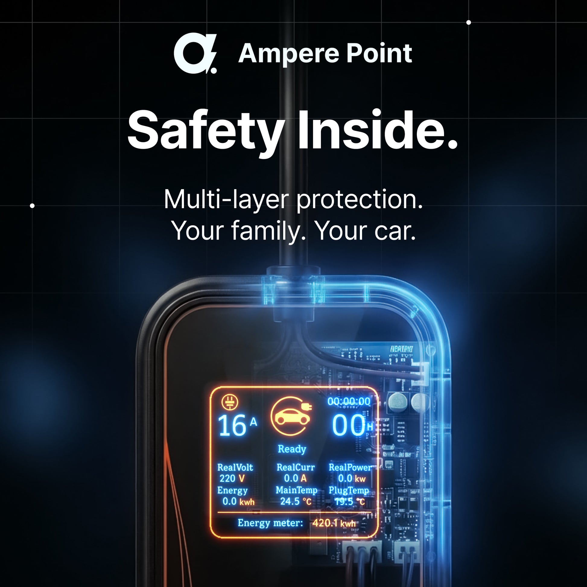 Monitorování teploty nabíječky v reálném čase pomocí vestavěného teplotního senzoru v zástrčce. Nabíječka se automaticky zastaví, pokud je překročena bezpečná teplota, a obnoví provoz, jakmile teplota klesne na normální hodnotu.