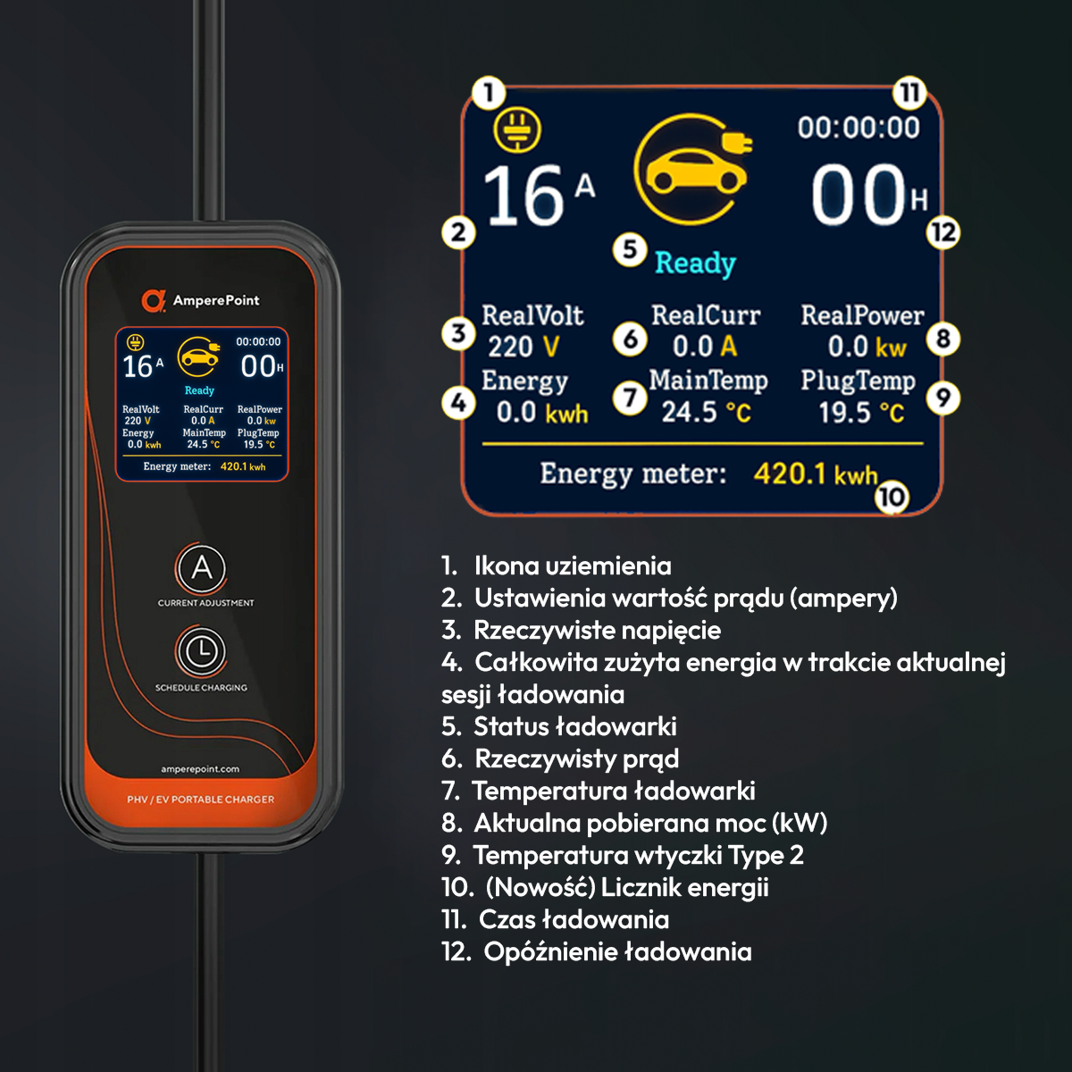 Vybaven 2,4" obrazovkou, která zobrazuje aktuální stav nabíjení, spotřebu energie a parametry napájení. To vám umožňuje s jistotou sledovat proces nabíjení a zajistit, aby vše probíhalo hladce.