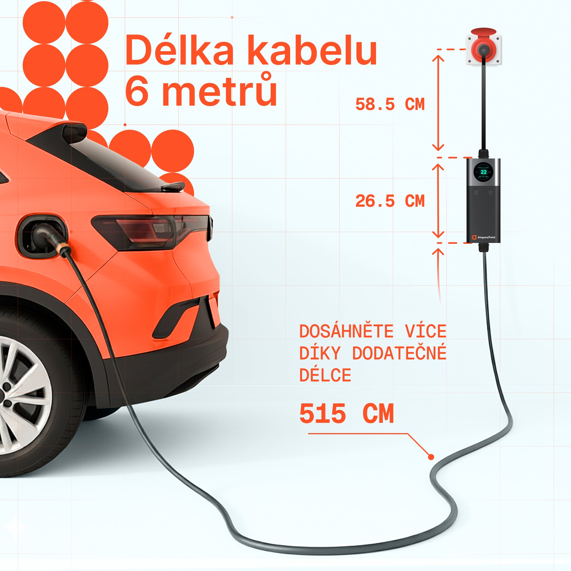 Kabel o délce 7,5 m zajišťuje pohodlné nabíjení bez ohledu na to, jak zaparkujete. Žádný stres, žádné natahování kabelu a žádná potřeba přesně umístit auto vedle zásuvky.