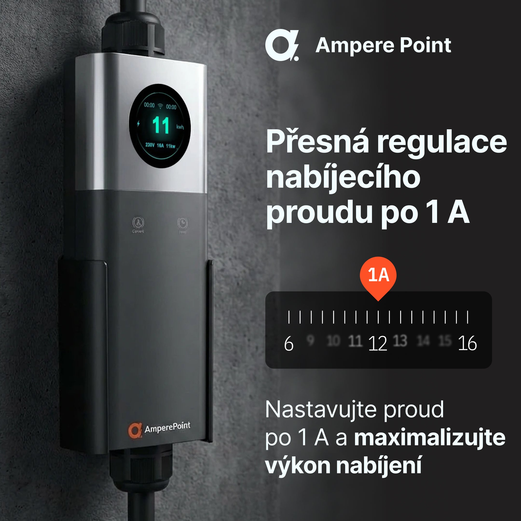 Nastavitelný nabíjecí proud v rozsahu 6–16A (po 1A) vám umožňuje dokonale přizpůsobit výkon vaší elektrické instalaci a aktuální zátěži vašeho domu. Díky přesné regulaci můžete bezpečně nabíjet své auto i při omezené kapacitě připojení.