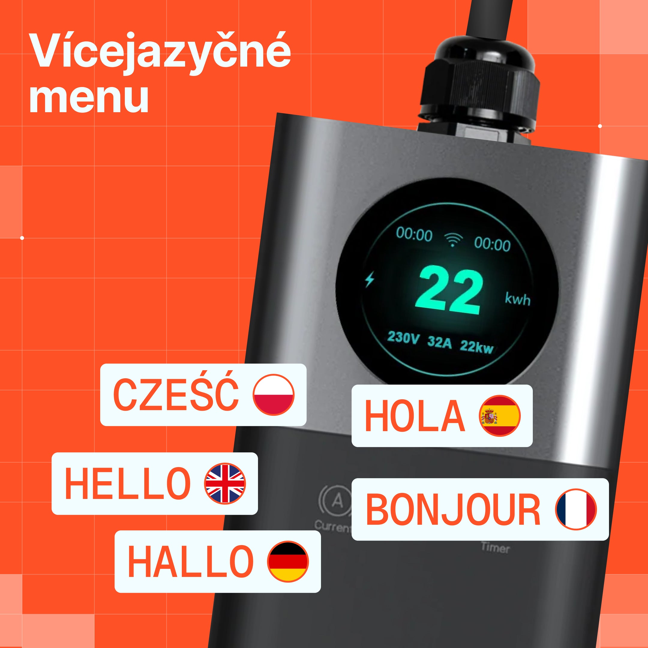 Vyberte si jazyk, který vám nejlépe vyhovuje. Intuitivní menu je k dispozici v několika jazykových verzích, což zajišťuje rychlé a bezproblémové nastavení – ať už nabíječku používáte kdekoli.